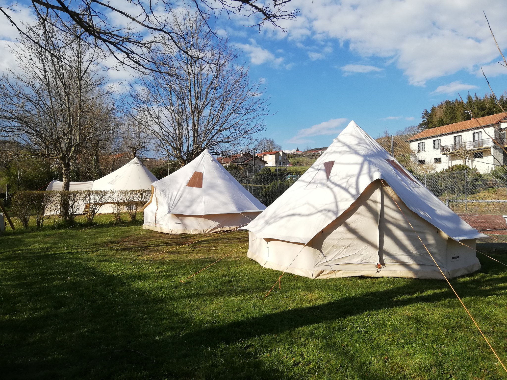 Les tentes Nomades ont l'électricité, elles sont équipées de lits de camp, une table de salon de jardin avec chaises.