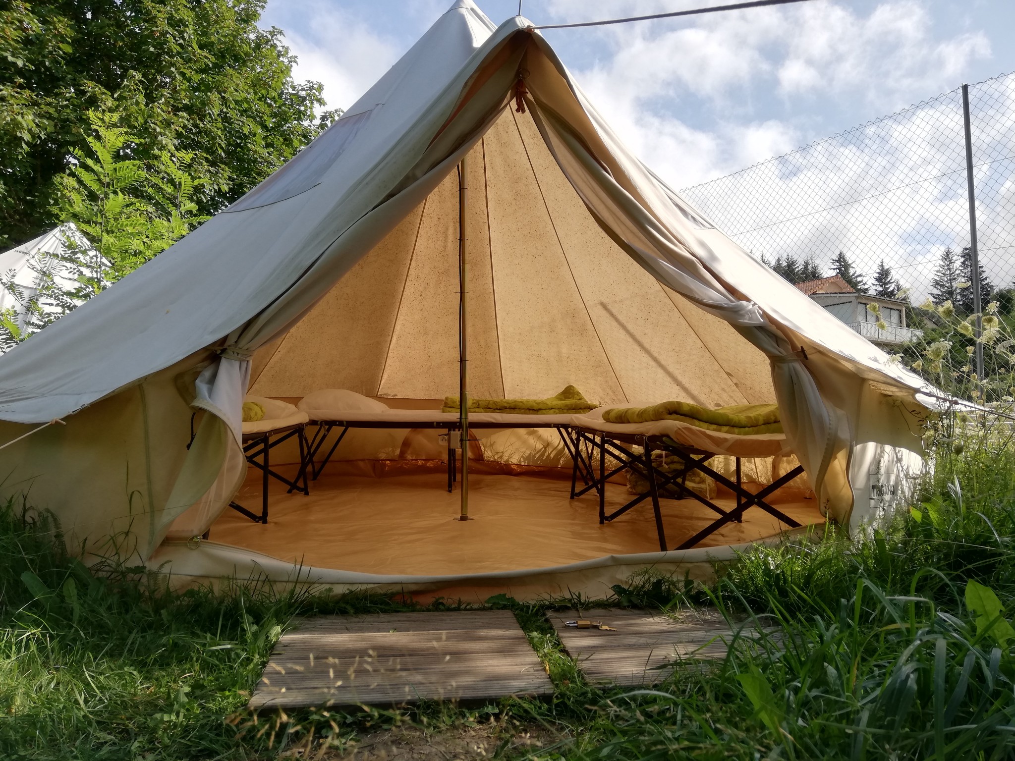 Installée pour juillet et août, notre Tente Nomade 2/4 places dispose d'un grand espace interieur permettant 2, 3, 4 couchages.