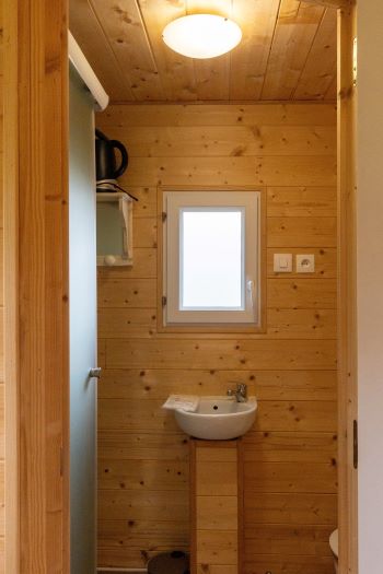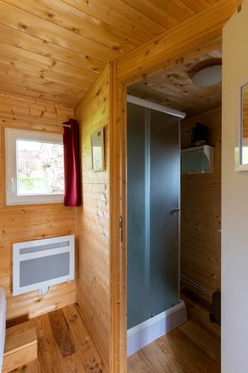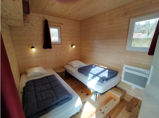 Le chalet Tiny est un chalet 2 places, 1 chambre avec 2 lits en 90 et 1 salle d'eau ( douche, lavabo et wc), petite terrasse équipée d'une table et ses chaises.